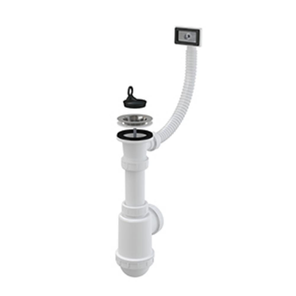 Sifón drezový s nerezovou mriežkou DN70 a flexi prepadom Pre drez s prepadom Materiál: polypropylén Vývod odpadu pripravený pre napojenie odpadovej rúrky O50 mm alebo O40 mm
