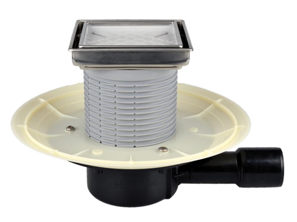 HL510Prblue-3020 Podlahový vpust DN 40/50 horizontálny, so zápachovým uzáverom PRIMUS BLUE - nezapácha ani v suchom stave, nadstavcom s možnosťou nalepenia dlažby 132 x 132 mm/104 x 104 mm. 10 - 80 mm skratiteľný nadstavec. Funkčná stavebná krytka je obsahom dodávky. Doporučená izolačná súprava pre stierkove hydroizolácie je HL83.3020