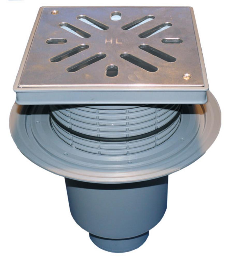 Dvorný vtok Perfekt DN110 vertikálny s izolačným tanierom, plastovým rámikom 240x240mm, nerezovou mriežkou 226x226mm, sifónom HL616SW/1