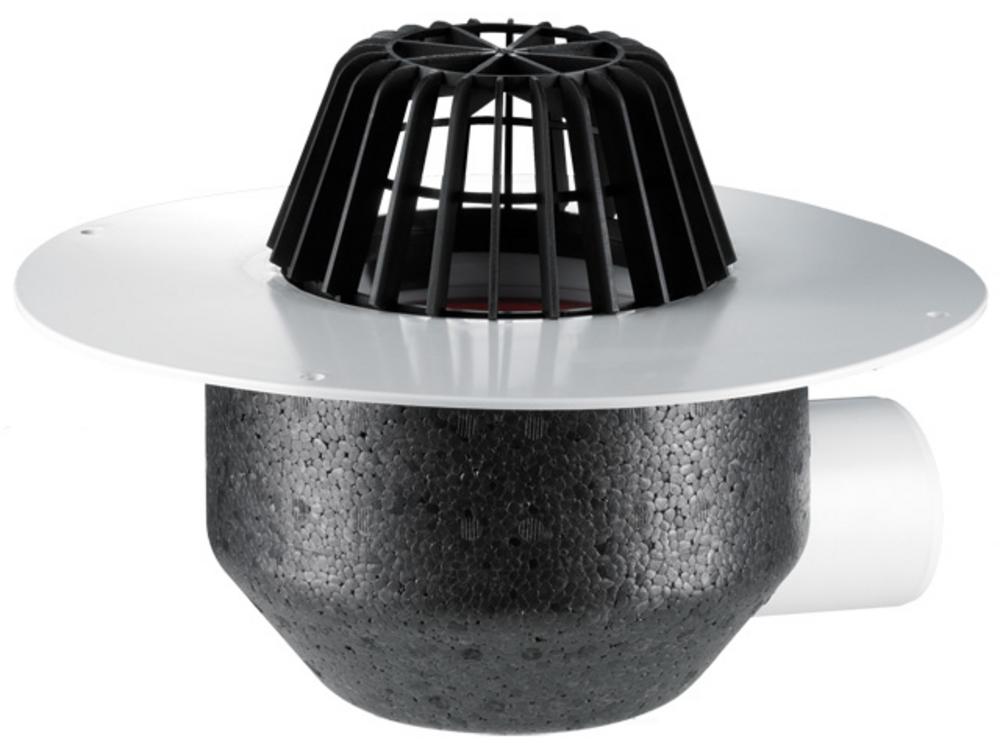 HL64P/1 Strešný vpust DN110 horizontálny s tepelne izolovaným telesom, PVC límcom navariteľným na PVC fólie, s lapačom lístia d 180mm. Stavebná krytka je súčasťou dodávky.