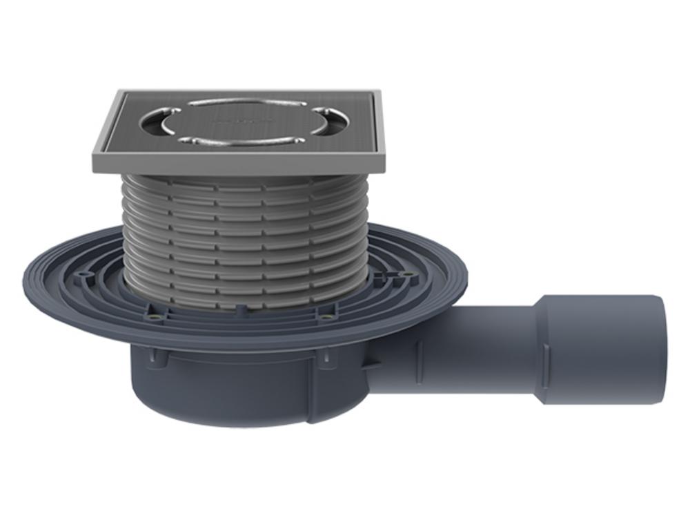HL90Pr Podlahový vpust DN40/50 horizontálny s protizápachovým uzáverom Primus blue - nezapácha ani v suchom stave, skrátiteľný nadstavec 12-70 mm, rámik z nereze 123x123mm a nerezovou mriežkou 115x11 mm, stavebnou ochrannou krytkou. Výškou zabudovania 57 mm.
