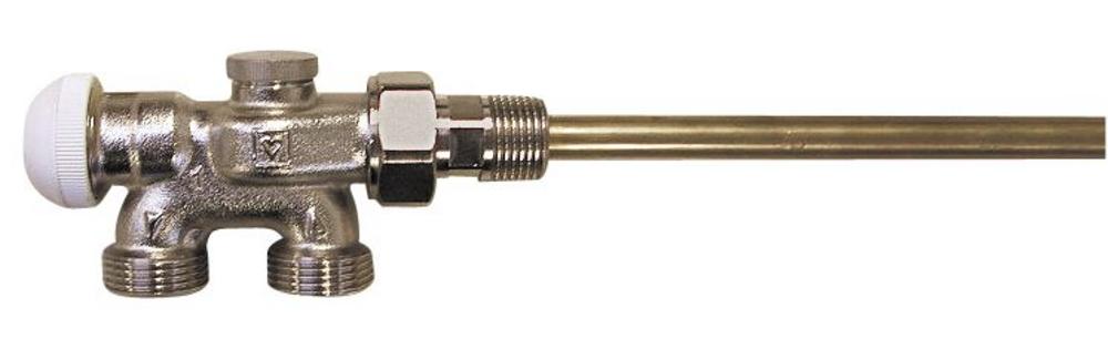 Štvorcestný termostatický ventil HERZ-VTA-40 DN 15, pre 1-rúrové sústavy, priamy, nastaviteľný pomer zatekanie, pripojenie VT ponornou rúrou 290 mm x 11 mm, pripojenie na rúru vonkajším závitom G 3/4"