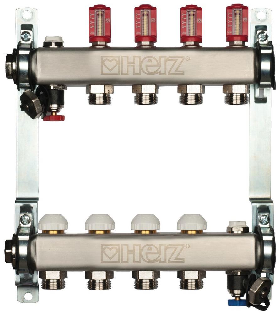 Súprava obsahuje: - zberač DN 25 s termostatickými zvrškami M 28x1,5 - rozdeľovač DN 25 s prietokomery 0-3 l/min, červené - odvzdušňovací ventil na rozdeľovači a zberači - vypúšťací ventil s hadico