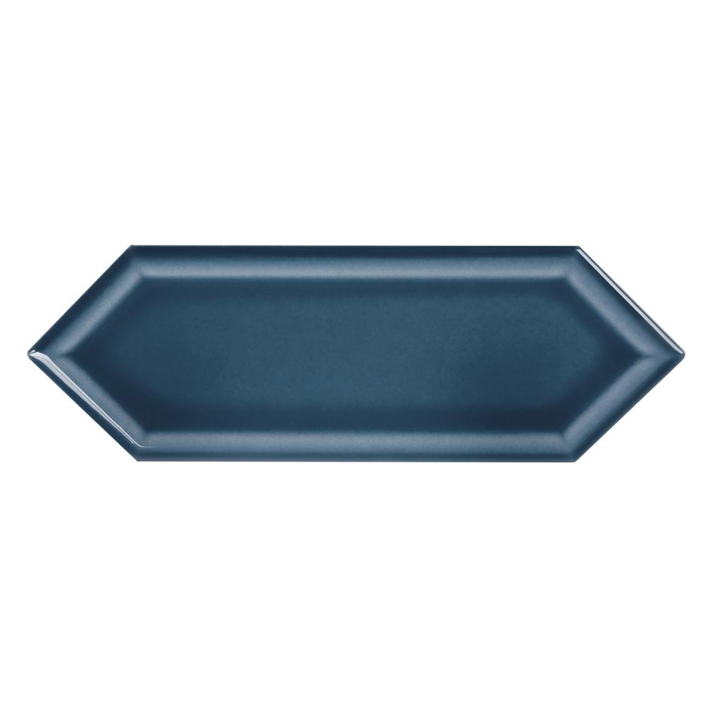 Blesklý modrý keramický obklad v tvare predĺženého hexagónu. Moderný nadčasový design.
