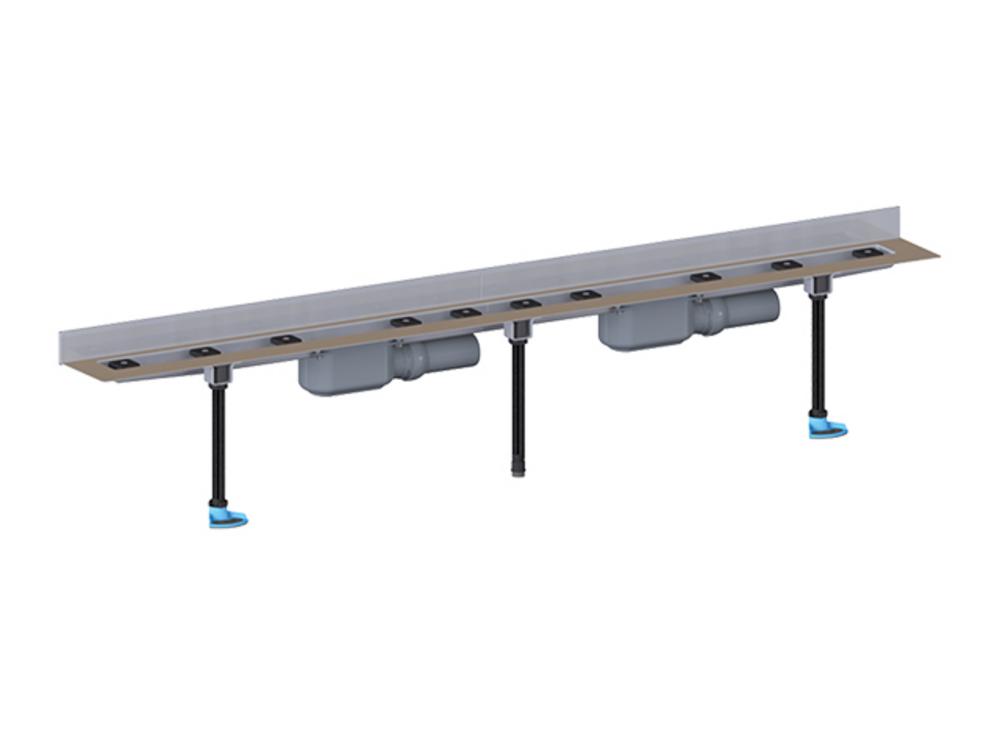 HL50WF.0/170 Veľmi nízky sprchovací žľab (90 mm) pre zabudovanie pri stene bez krytky, pozostávajúci z nerezového vylisovaného telesa bez zvarov s popieskovanou prírubou na dobré prepojenie s náterovými hydroizoláciami, 2 ks zápachových uzáverov z PP s goľovým kĺbom na nastavenie sklonu vodorovného odtoku DN50, vyberateľným zápachovým uzáverom 30 mm (POZOR: Nezodpovedá norme). Teleso žľabu je spád