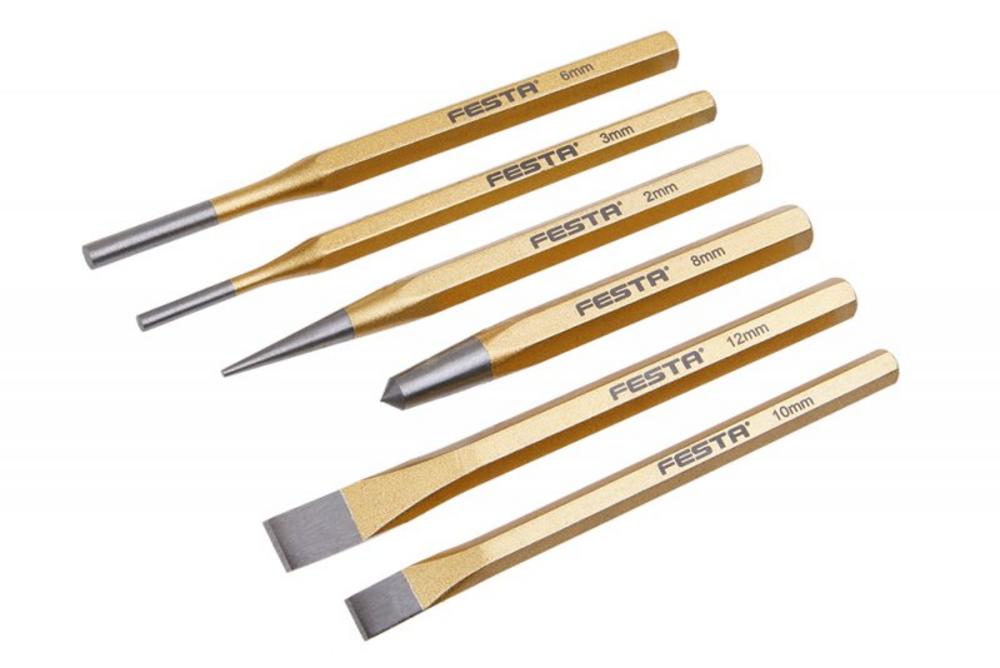 Sada sekáčov, dulčíkov a priebojníkov FESTA vyrobená z chróm vanádovej ocele. Sada obsahuje 6 ks dulčík: 2x140, 8x115mm, sekáč: 12x152, 10x142, priebojník: 3x152, 6x152.