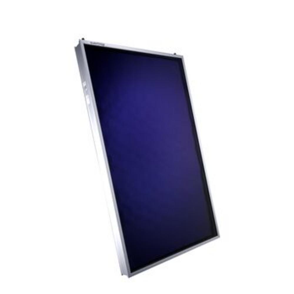 The flat-plate collectors have transparent solar safety glass, a laser welded aluminium double harp absorber with copper pipe register for optimal energy yield and low pressure loss, a rear wall insulation and a circumferential frame insulation made of mineral wool and a UV-resistant EPDM glass seal.