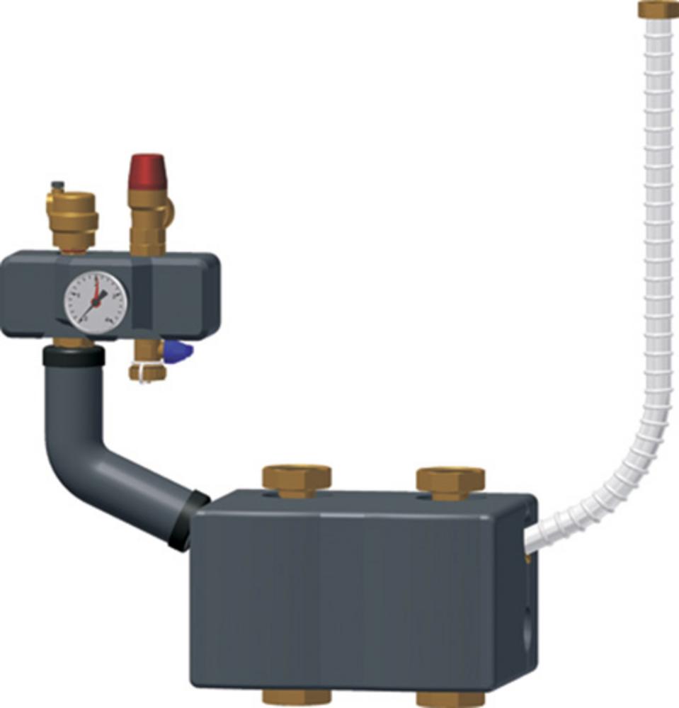 k tlakovému ooddělení otopné soustavy od zdroje tepla (staré soustavy, systémy PV bez kyslíkové bariéry ...) obsahuje: deskovy´ vy´měník, připojovací šroubení, ruční odvzdušňovací armaturu, vlnovcovou trubku, víkovy´ ventil, pojistnou skupinu s připojovac