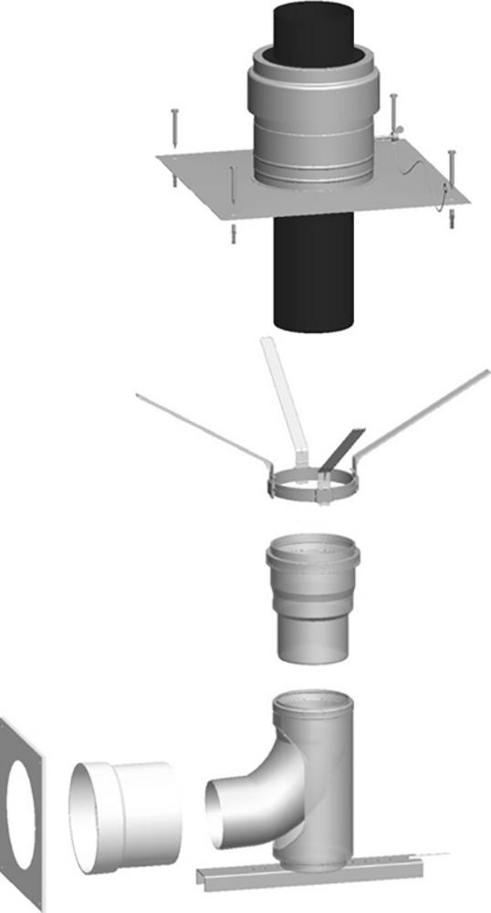 pro připojení kaskády kotlů, obsahuje: kryt šachty DN 110 včetne trubky vyústění, 6 distančních držáků DN 110, opěrné koleno 87° DN 110 s podpěrou /místo podpěry se na podepření může použít spalinová trubka příslušné délky/, přechod stěnou DN 110/160, ro