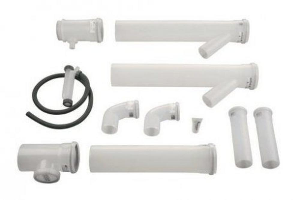 Buderus základná spalinová kaskádová sada DN 125 pre 2 kotly s výkonom kotla do 60 kW Základná kaskádová sada sa skladá z: sifón (dlhé vyhotovenie) koncový kus s odvodom kondenzátu a skrutkovacím krytom zberná rúra krátka so šikmým vývodom zberná rúra dlhá so šikmým vývodom rúra odvodu spalín, dĺžka 500 mm, materiál plast PP