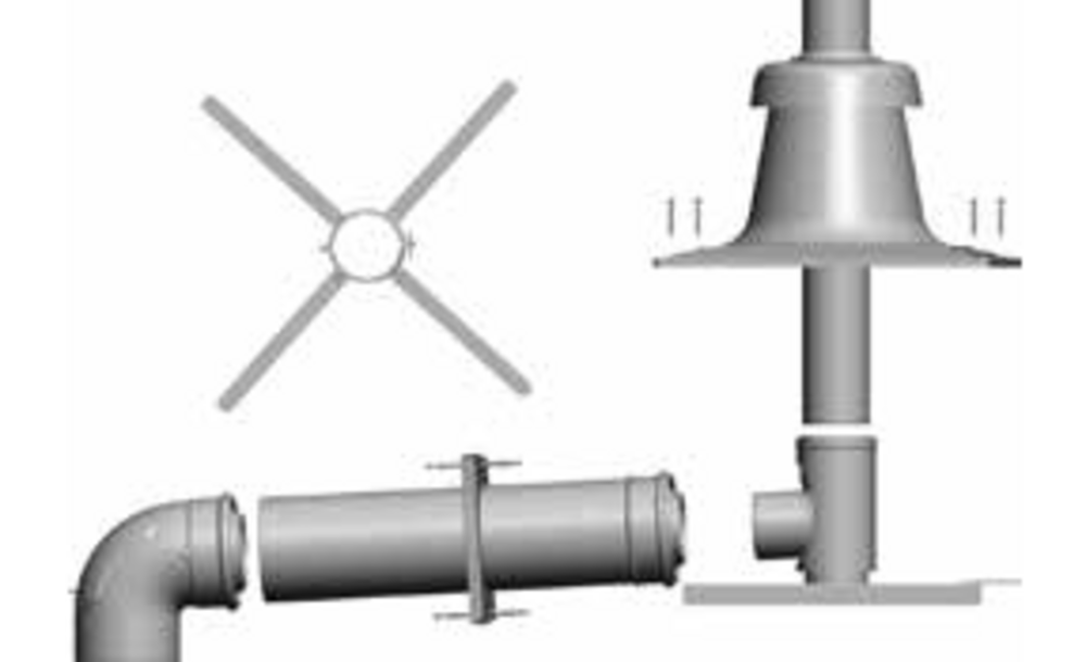 SESTAVA OBSAHUJE: revizní koleno 87° DN 80/125, trubku délky 500mm DN 80/125, krycí rozetu, opěrné koleno 87° DN 80 s nosným profilem, 4 ks distančních držáků a kryt šachty.