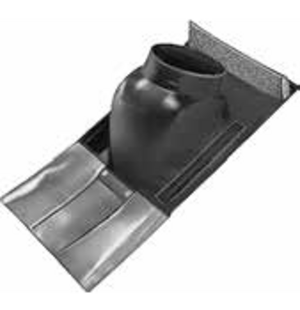 S adaptérem pro trubku na svislý přechod střechou, vhodná pro střešní krytiny s profilovanými taškami. barva černá s ohebným olověným překrytím dole