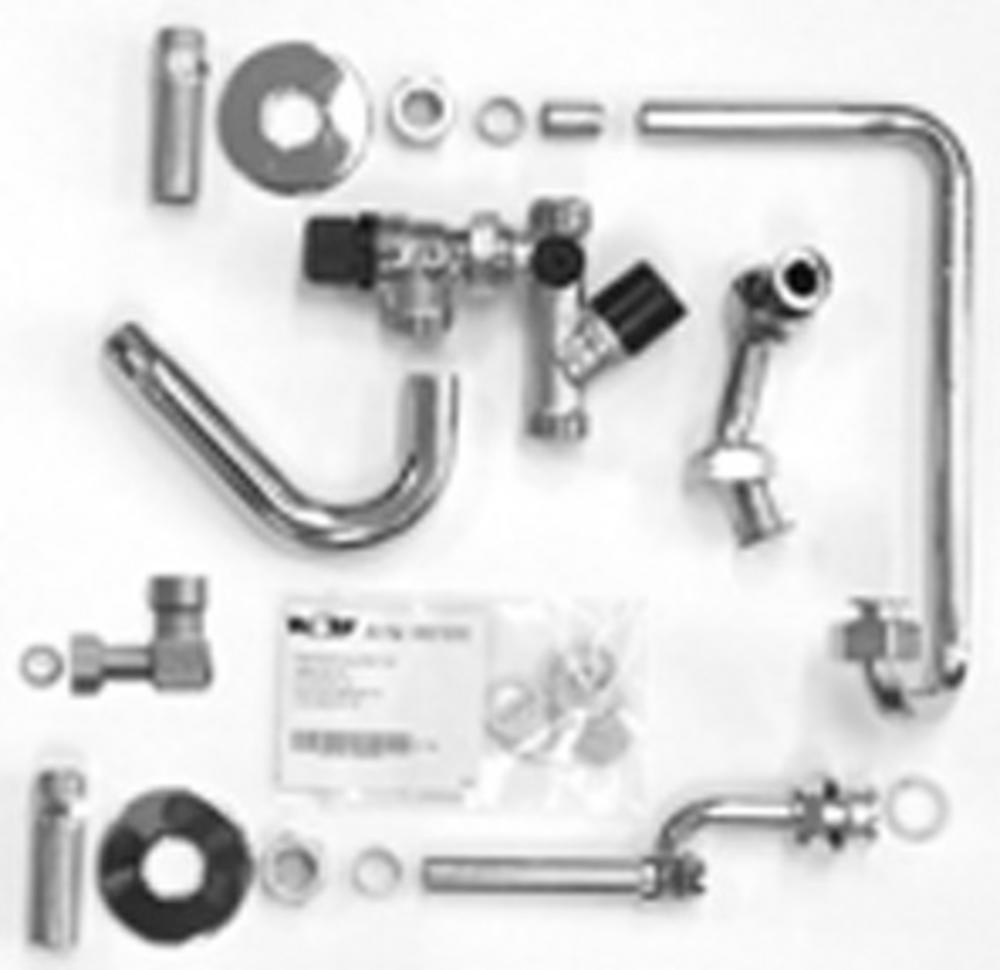 Přípojka teplé vody, krycí rozeta, závitová trubka se svěrným kroužkem G 1´´, opěrné pouzdro, pojistná skupina bez omezovače tlaku, přípojka na pojistnou skupinu, přípojka pojistné skupiny na přívod studené vody, koleno, 3 těsnění 3´´.