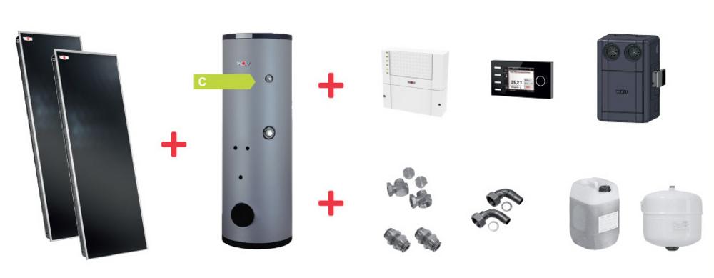Sestava s plochými kolektory CFK-1 a zásobníkem SEM-2-300 Obsahuje: 2x solární kolektor CFK-1 2x kompenzátor Připojovací sada Regulační sada SM1-2 Čerpadlová skupina 10, se samoregul. úsporným čerpadlem Solární expanzní nádoba 25 l Teplonosná kapalina ANRO - balení 20 kg Stacionární solární ohřívač vody SEM-2-300 Připojovací sada solární skupiny