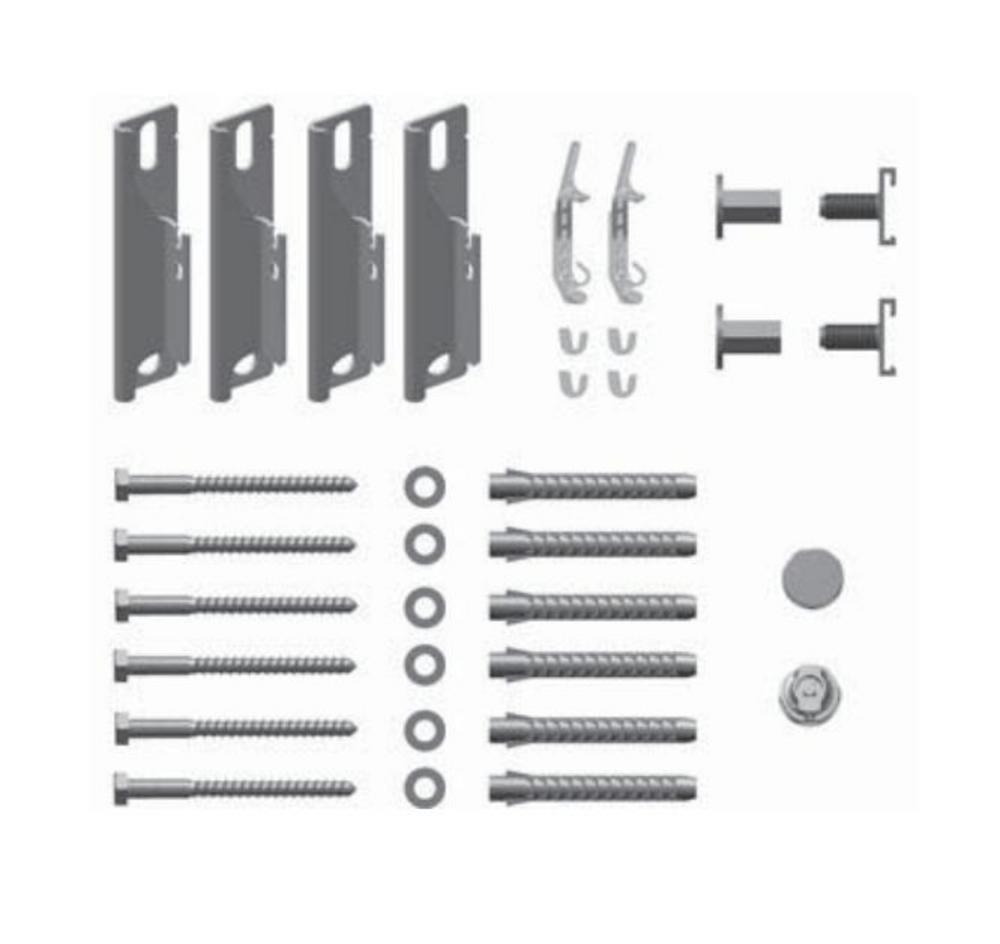 Set pozostáva z: - 4 nástenné krátke konzoly, - 6 skrutky, - 6 podložky, - 6 hmoždinky, - 4 protihlukové svorky, - 2 poistky proti vybratiu pre nástennú konzolu, - 2 rozpierky - 1 slepý uzáver Určené pre Verteo radiátory, pre typ 20,21,22