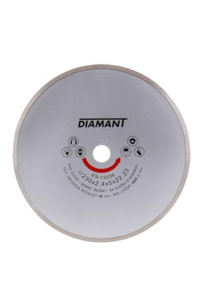 Diamantový kotúč DIAMANT, prevedenie: PLNÝ - celoobvodový, kvalitná diamantová vrstva s vysokým obsahom diamantového prachu, presné spracovanie - napojenie na nosný disk kotúča odolávajúci vysokým teplotám, použitie: určený pre mokré i suché rezanie dlaž