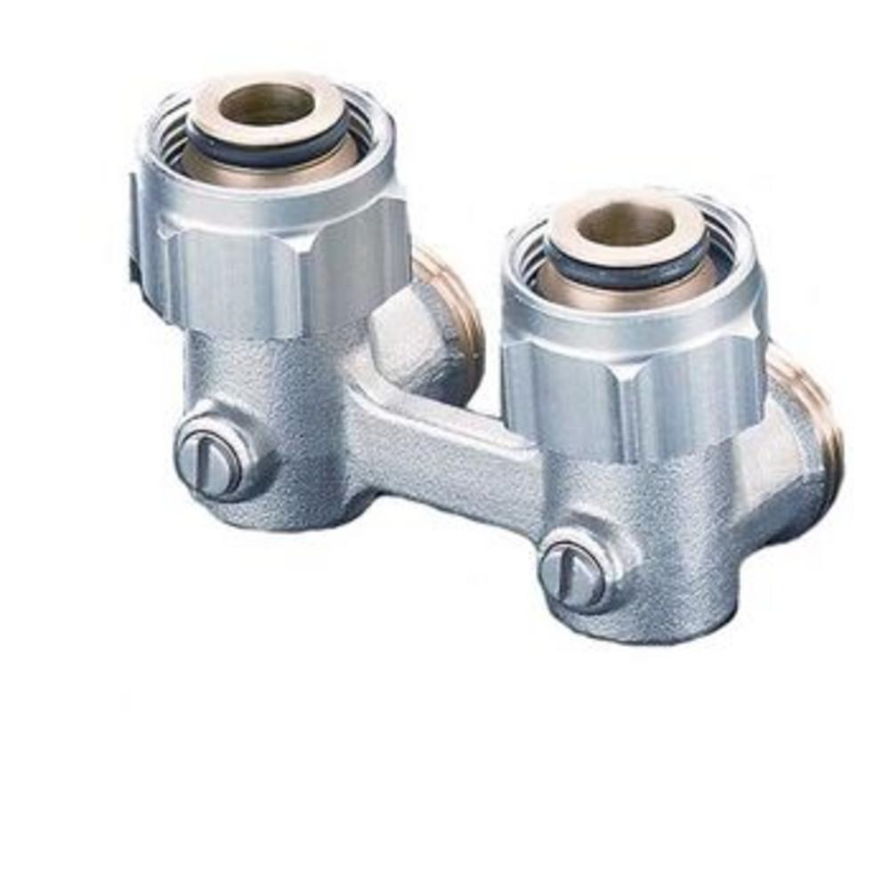 Dvoutrubkový blok z mosazi, poniklovaný, rozteč 50 mm, měkké těsnění k radiátoru. K uzavření otopného tělesa.