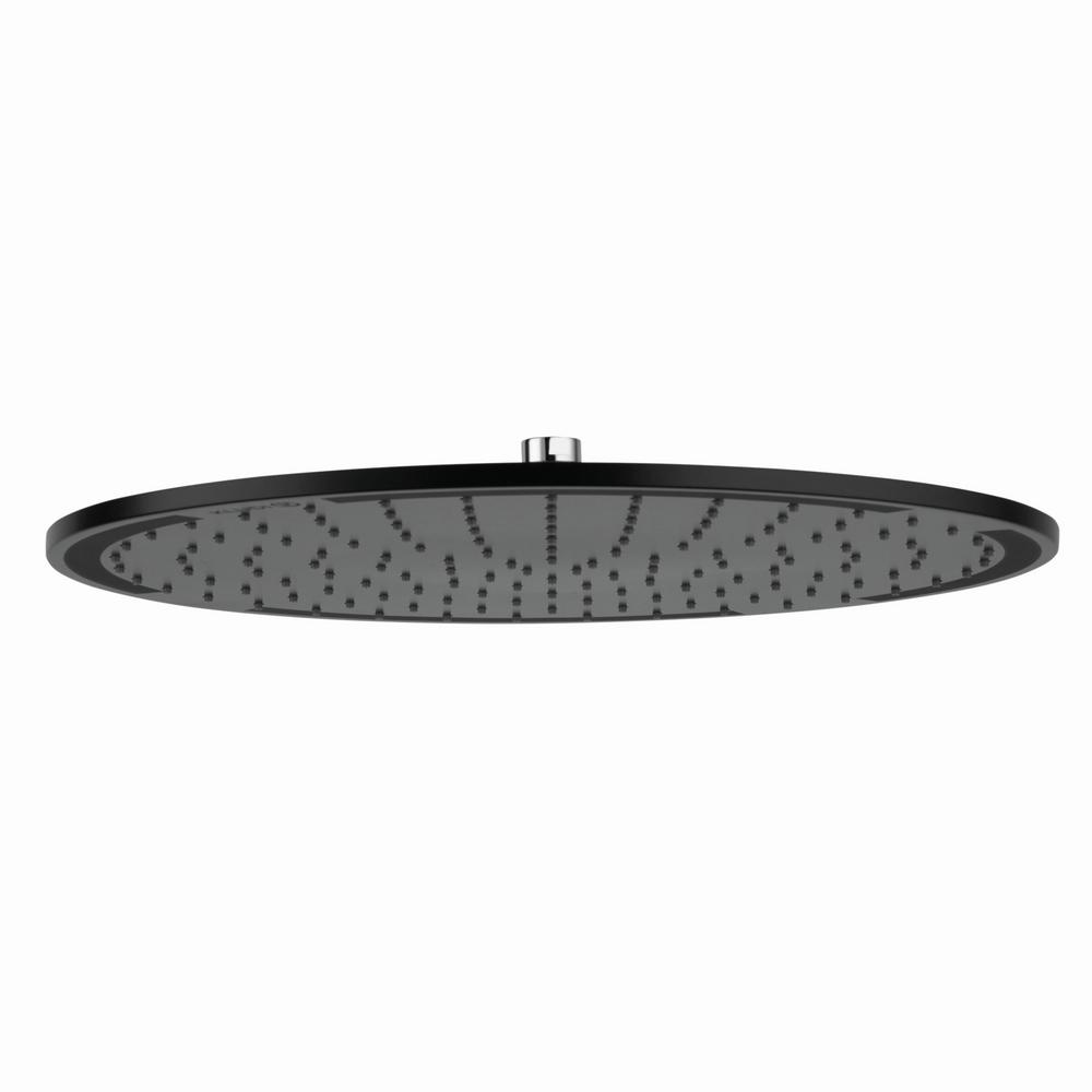 Hlavová sprcha, 1jet povrchová úprava čierny mat a chróm prevedenie kov / plast tanierová hlavová sprcha DN 15 priemer 400 mm 1 druh prúdu spotreba vody horné sprchy čiže prietok prietok 23 l / min vody pri tlaku 3 bary Rýchle čistenie vápenatých usadenín na silikónových tryskách guľový kĺb pre natáčanie prípojka G 1/2 bez sprchového ramená