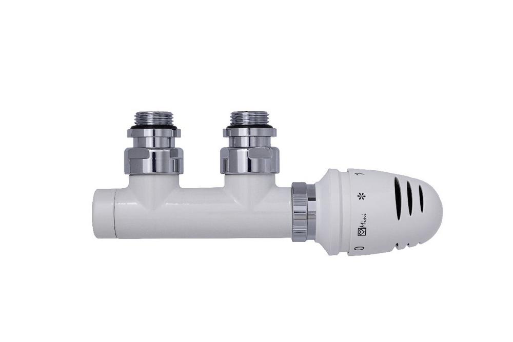 1. Pripájací diel HERZ-3000 2R-Design, rohový, pre 2-rúrové sústavy, 1 ks Vratné potrubie z vykurovacieho telesa (spiatočka) musí byť napojené pri termostatickom zvršku. Prívodné potrubie je napojené na druhom vývode bez termostat. zvršku. Osová vzdialenosť pripojenia 50 mm. 2. Termostatická hlavica "Mini" Design, 1 ks s kvapalinovým snímačom (hydrosnímač), s polohou „0“ rozsah požadovaných hodnôt 6-30 °C. 3. Prechodka Design - M 22x1,5 - 15x1, chróm, 2 ks s masívnym gumovým tesnením pre rúru. 4. Prechodka Design - M 22x1,5 - 15x1, chróm, 2 ks so svorkovým krúžkom kovovo tesniacim na rúrku, Nie je vhodná pre pochrómované rúry a rúry z ušľachtilej ocele. 5. Prechodka Design - M 22x1,5 - 16x2, chróm, 2 ks pre rúry z PE-X, PB a kompozitných plastov.