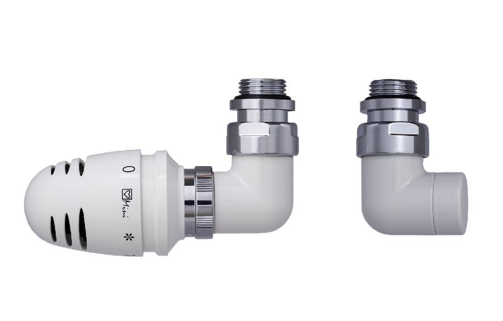1. Pripájací diel HERZ-3000 2R-Design, rohový, pre 2-rúrové sústavy, 1 ks Vratné potrubie z vykurovacieho telesa (spiatočka) musí byť napojené pri termostatickom zvršku. Prívodné potrubie je napojené na druhom vývode bez termostat. zvršku. Osová vzdialenosť pripojenia 50 mm. 2. Termostatická hlavica "Mini" Design, 1 ks s kvapalinovým snímačom (hydrosnímač), s polohou „0“ rozsah požadovaných hodnôt 6-30 °C. 3. Prechodka Design - M 22x1,5 - 15x1, chróm, 2 ks s masívnym gumovým tesnením pre rúru. 4. Prechodka Design - M 22x1,5 - 15x1, chróm, 2 ks so svorkovým krúžkom kovovo tesniacim na rúrku, Nie je vhodná pre pochrómované rúry a rúry z ušľachtilej ocele. 5. Prechodka Design - M 22x1,5 - 16x2, chróm, 2 ks pre rúry z PE-X, PB a kompozitných plastov.