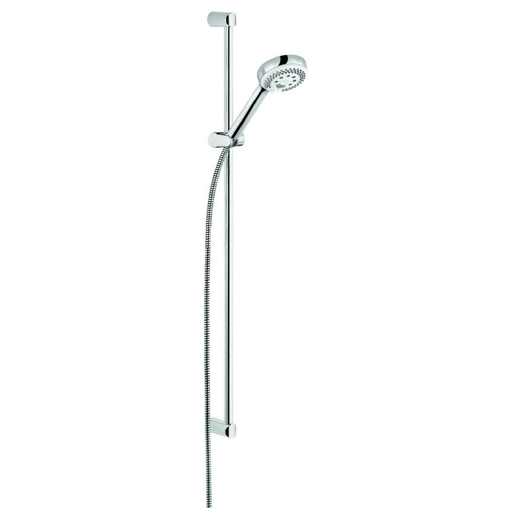Sprchový set, 3 prúdy, bez batérie prevedenie chróm dĺžka sprchovej tyče 900 mm priemer tyče O 23 mm s posuvným držiakom Kludi Logo 3S ručná sprcha DN 15 priemer ručnej sprchy 96 mm prietok 13 l / min (Booster) / 10 l / min (Smooth) / 15 l / min (Volumen) pri 3 bar s rýchlym čistením vápenatých usadenín Kludi Logoflex - sprchová hadica G 1/2 x G 1/2, dĺžka 1600 mm obalená umelou hmotou s kónickými
