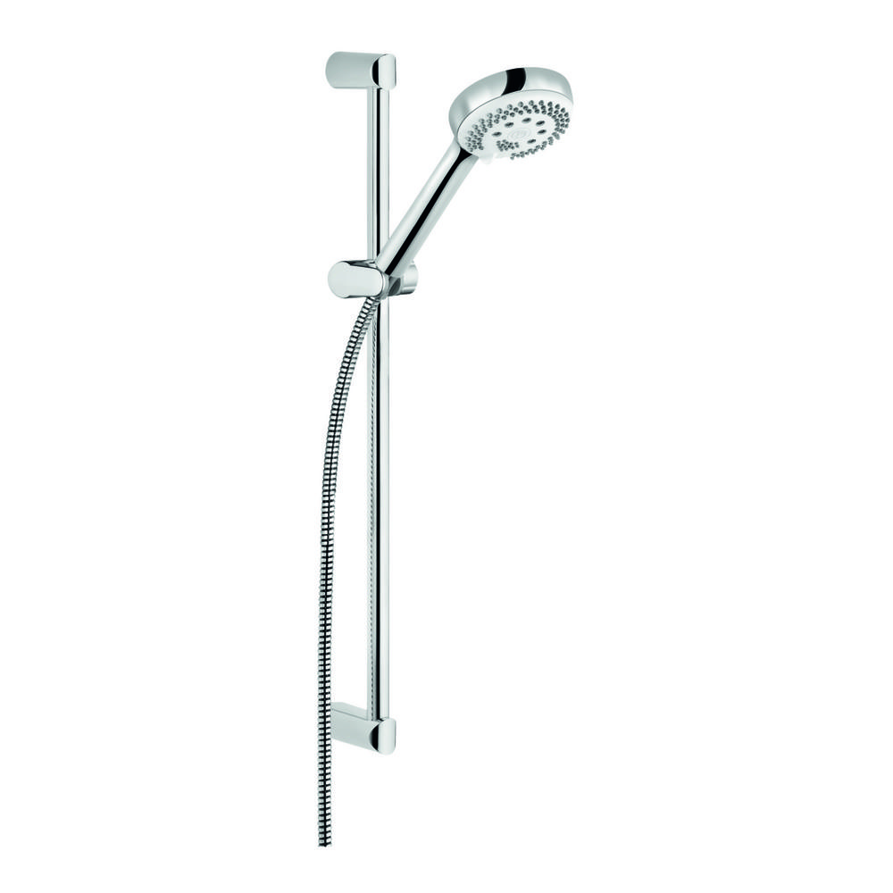Sprchový set, 3 prúdy, bez batérie prevedenie chróm dĺžka sprchovej tyče 600 mm priemer tyče O 23 mm s posuvným držiakom Kludi Logo 3S ručná sprcha DN 15 priemer ručnej sprchy 96 mm prietok 13 l / min (Booster) / 10 l / min (Smooth) / 15 l / min (Volumen) pri 3 bar s rýchlym čistením vápenatých usadenín Kludi Logoflex - sprchová hadica G 1/2 x G 1/2, dĺžka 1600 mm obalená umelou hmotou s kónickými