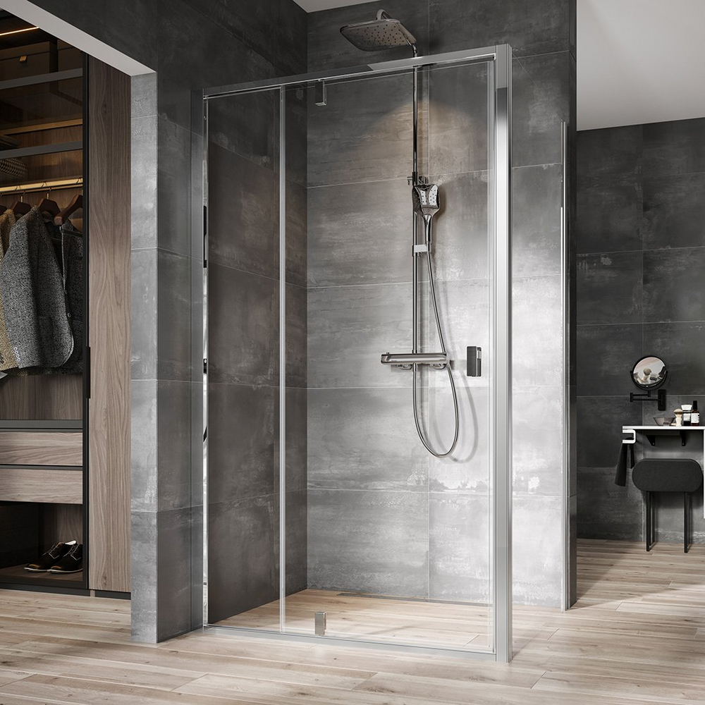 Pevná stena Nexty vo vyhotovení lesklý chróm a s výplňou z číreho skla s ochrannou vrstvou Ravak AntiCalc®. Otočný pivotový systém otvárania. Otočiteľný výrobok pre ľavý aj pravý variant.