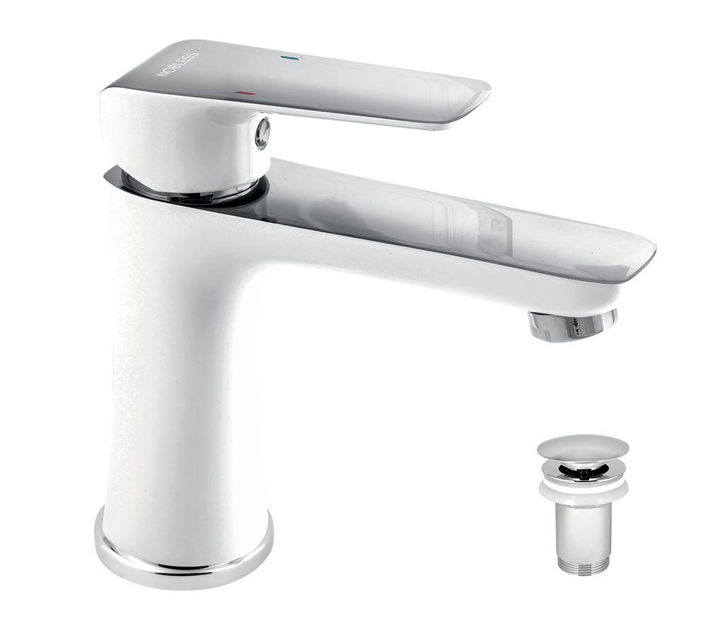Vodovodná batéria umývadlová stojanková páková biela/chrómová s odpadovou súpravou výška 15cm, vr.click-clack, pre um s prepadom Tina Novaservis