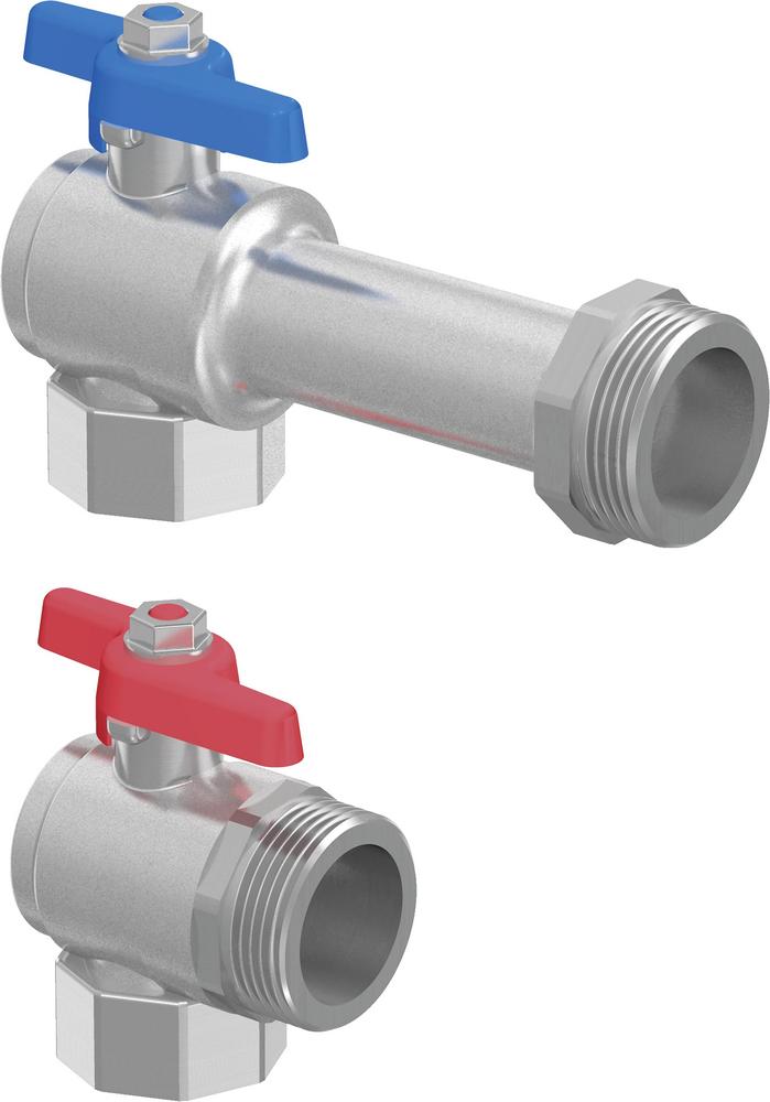 Uponor rohový guľový ventil G1"- Rp 3/4 "" Rohový guľový ventil s plochým tesnením pre vertikálne pripojenie do rozdeľovača. Sada pozostáva z 2 mosadzných guľových ventilov s červenou a modrou rukoväťou, poniklovaná mosadz. Potrebná dĺžka v priestore skrinky: 125 mm + dĺžka rozdeľovača.