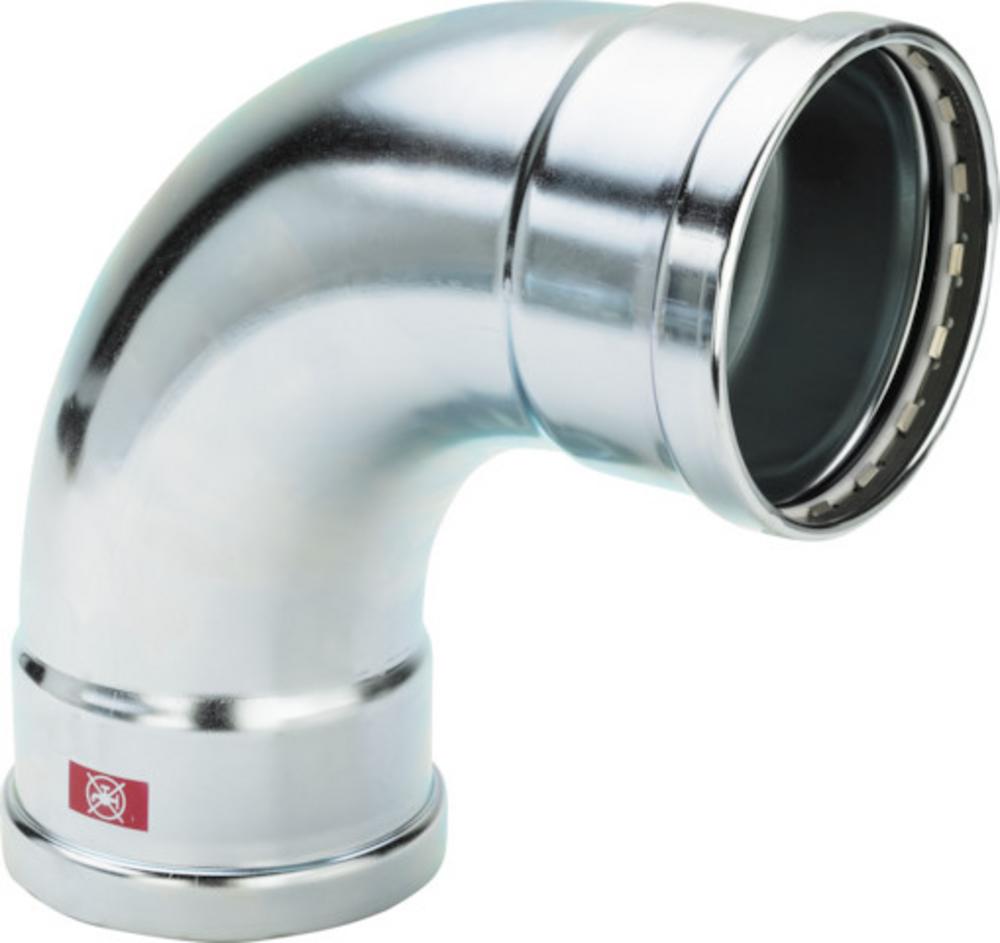 Prestabo XL -oblouk 90° s SC-Contur - nelegovaná ocel, pozinkováno - lisovací přípoje Vybavení těsnění EPDM, zářezné kroužky, dělicí kroužky model 1116XL artikl 597 580 osvědčení VdS d: 88,9