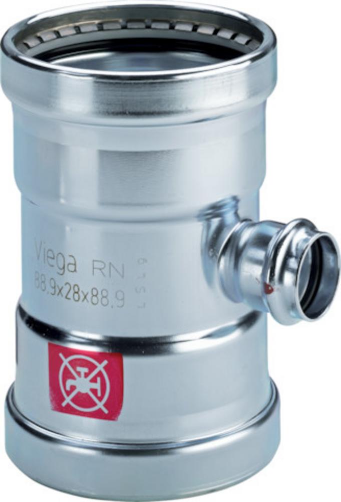 Prestabo XL -T-kus s SC-Contur - nelegovaná ocel, pozinkováno - lisovací přípoje Vybavení těsnění EPDM, zářezné kroužky, dělicí kroužky model 1118XL artikl 597 849 osvědčení VdS d1: 64,0 d2: 28 d3: 64,0