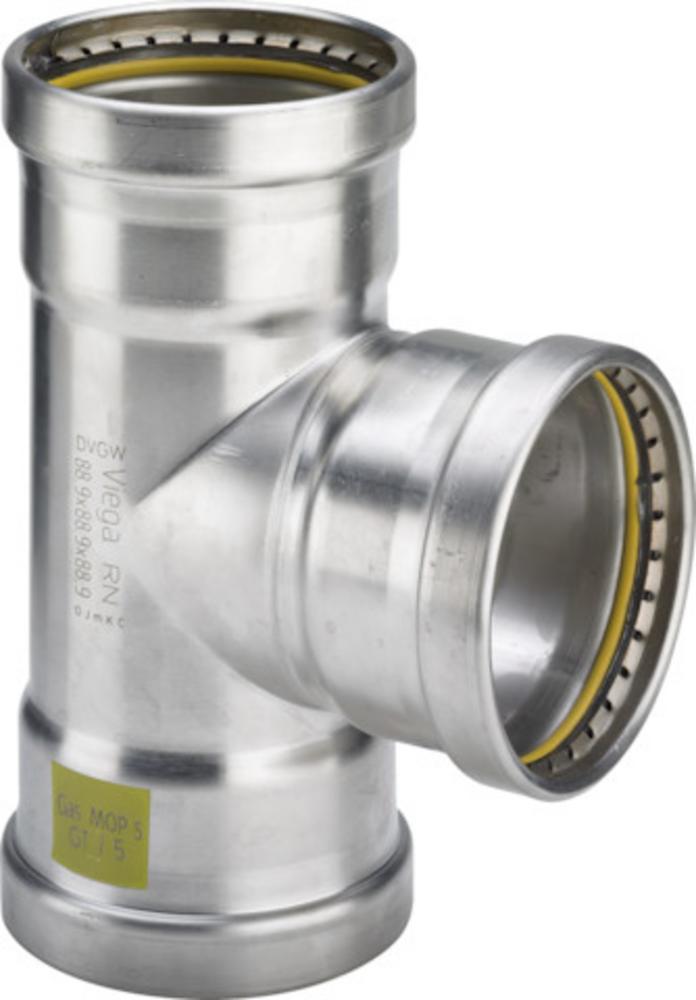 Sanpress Inox G XL -T-kus s SC-Contur - ušlechtilá ocel - lisovací přípoje Vybavení těsnění HNBR, zářezné kroužky, dělicí kroužky model 0218XL artikl 578 213 d1: 76,1 d2: 76,1 d3: 76,1