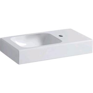 Malé umývadlo Geberit iCon s odkladacou plochou: Biela / KeraTect, B=53cm, H=13.5cm, T=31cm, Otvor pre batériu=Vpravo, Prepad=Bez, Úložná plocha=Vpravo Technické údaje Materiál: Jemný žiaruvzdorný íl Vlastnosti Asymetrický tvar S odkladacou plochou